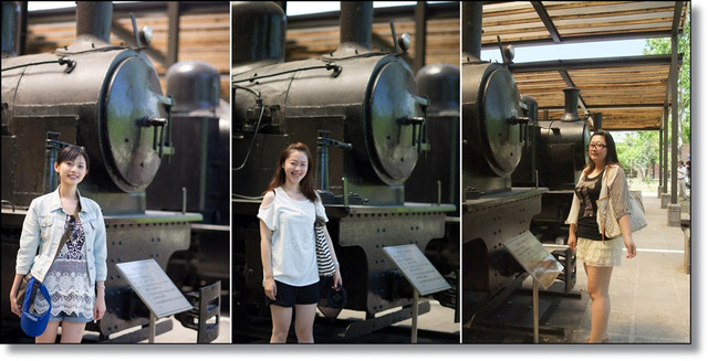 在車站的外邊。有放一輛老火車頭。後面也很遊意的掛著客運車廂。