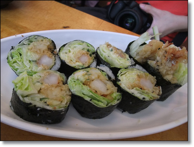 酥脆的炸蝦配上蘿蔓生菜。甜而不膩的美奶滋當佐料。捲上海苔最後再加上一點點的米粒收口。