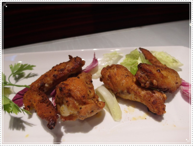 接這立刻又送來辣味烤雞翅。這次我有吃。真的是辣的。但皮烤的很酥。肉嫩又多汁。好吃!